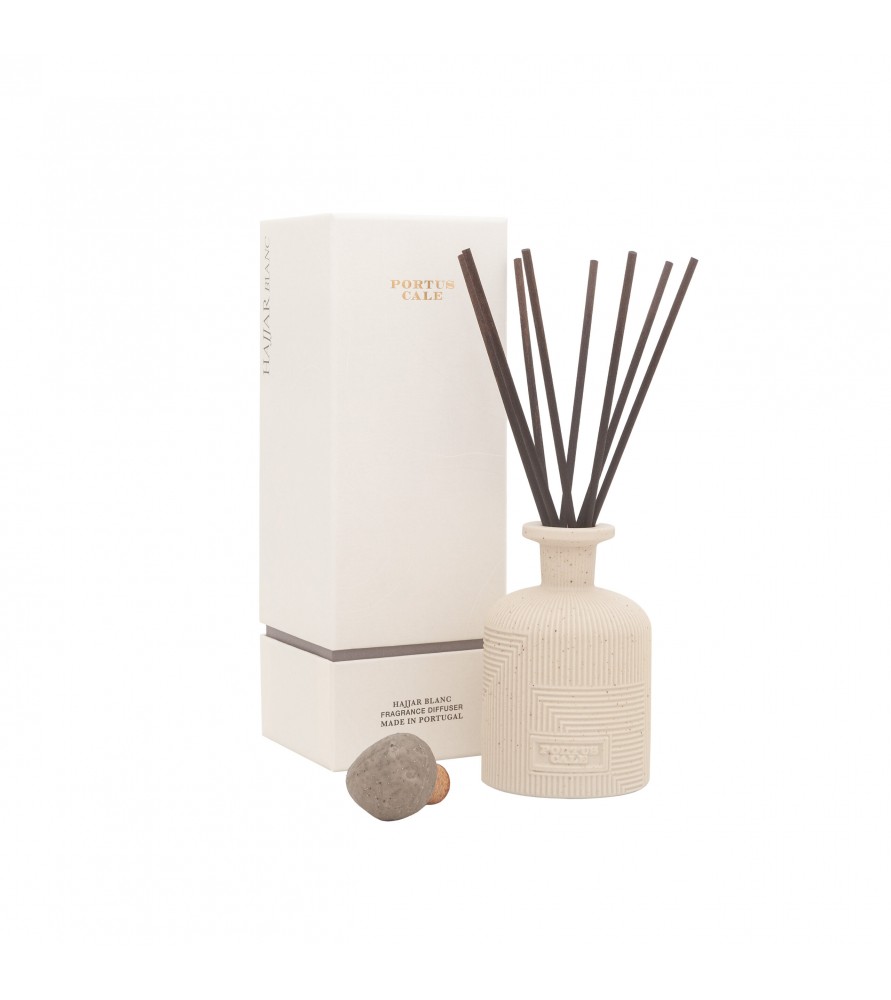 Feito em Portugal por mestres ceramistas, o difusor Hajjar Blanc é uma peça de design intemporal, onde a fragrância sofisticada da coleção se funde com a arte da cerâmica. Inspirado na textura e na força das rochas, o seu frasco cerâmico evoca a beleza bruta da Natureza, tornando cada espaço mais elegante e sereno.