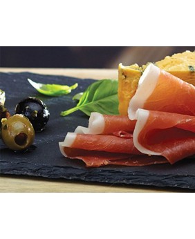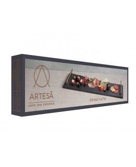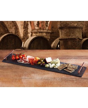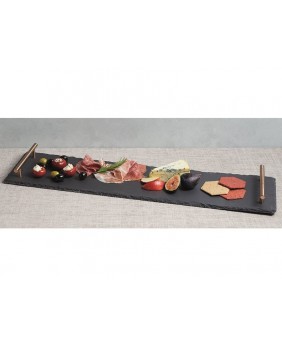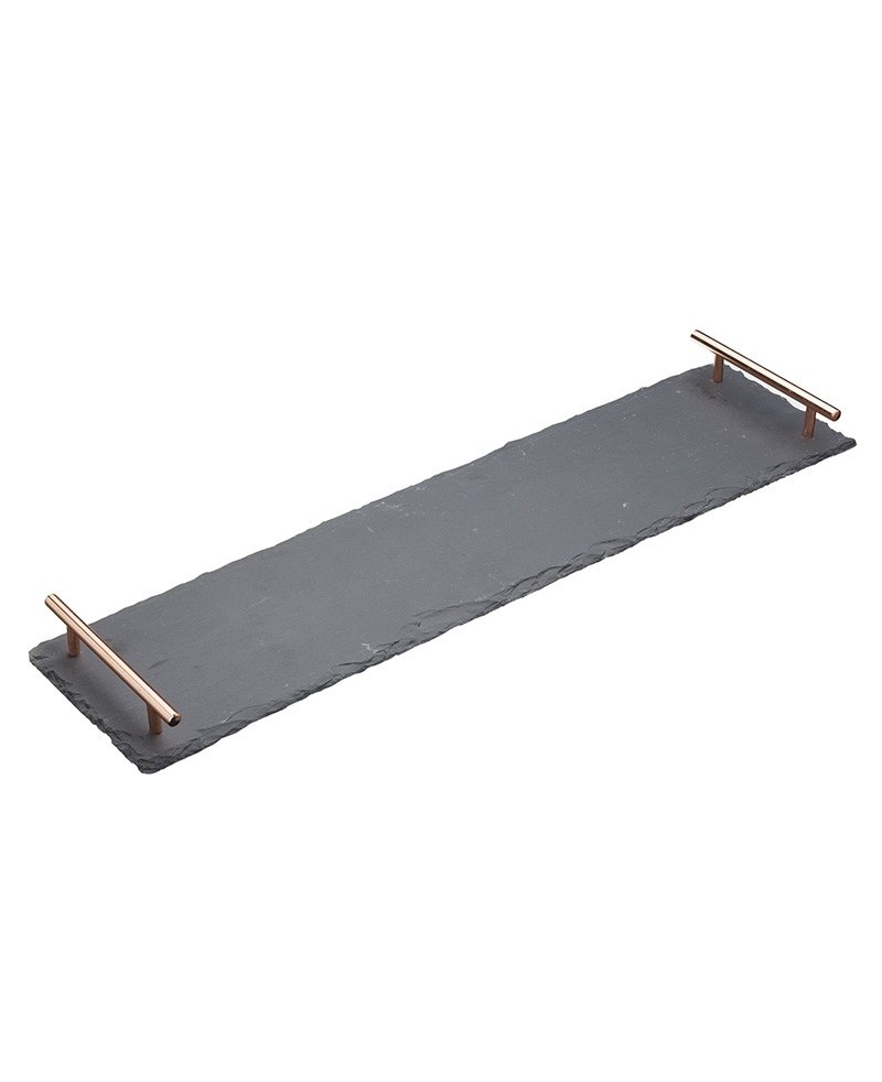 Apresente uma miscelânea de antepastos, sobremesas ou entradas com esta travessa de ardósia natural. O tom preto natural e a textura irregular adicionam um cenário elegante para servir todos os tipos de carnes frias, queijos e frutas diretamente da ardósia. As pegas de cor cobre dupla metal escovado também facilitam o transporte para os convidados e também o uso como uma bandeja para servir sobremesas ou tapas.