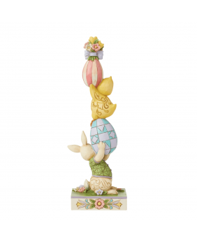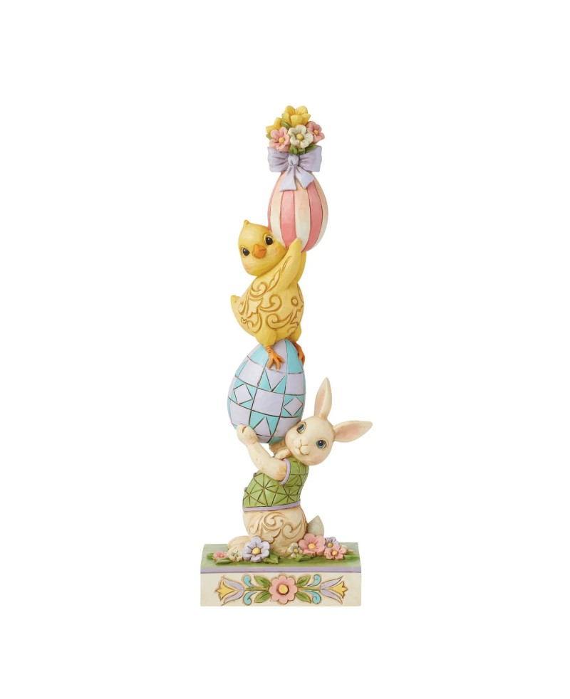 Esta encantadora estatueta de Jim Shore apresenta uma imponente pilha de ovos de Páscoa com padrões vibrantes. Os ovos estão delicadamente equilibrados por um coelhinho e um pintinho alegres, que exibem a intricada técnica de rosemaling característica, em meio a um cenário de flores primaveris desabrochando.