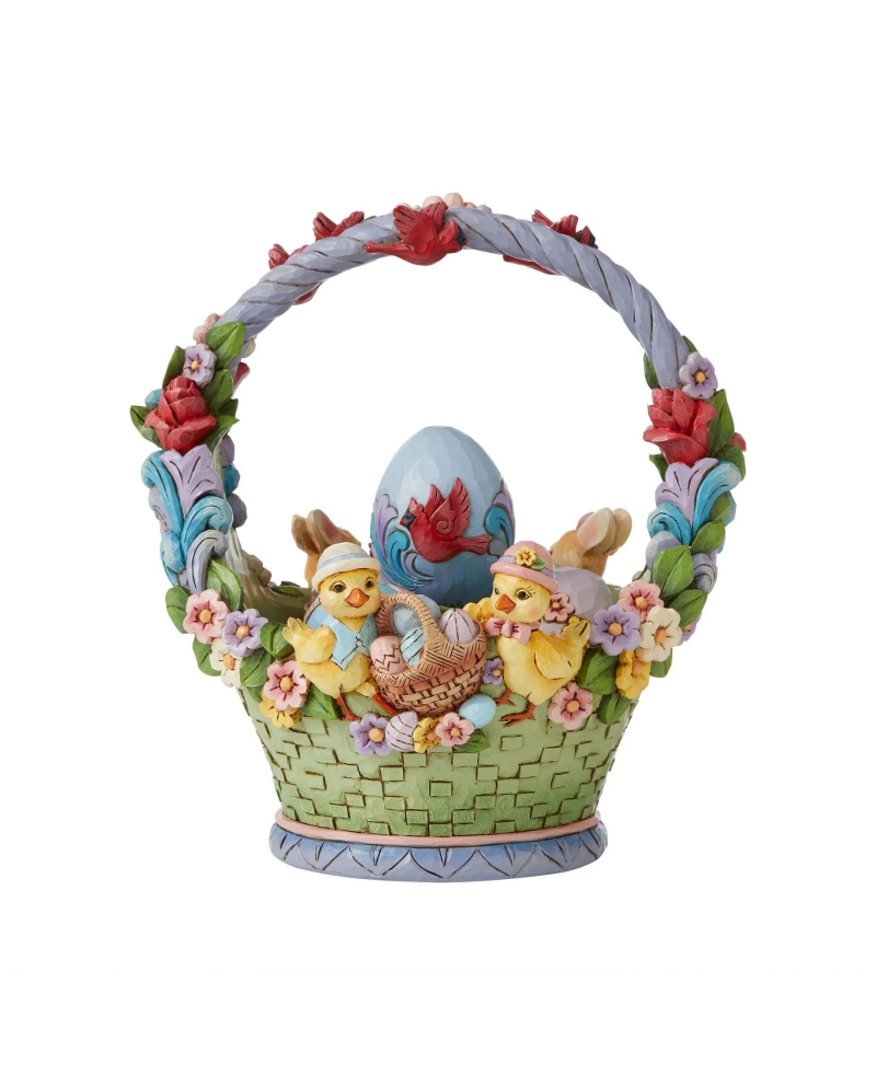 A 17ª Cesta de Páscoa anual de Jim Shore é a melhor até agora! Belamente feita à mão com detalhes delicados, este design apresenta coelhinhos e pintinhos em seus melhores trajes de domingo, preenchendo sua cesta com ovos de Páscoa. Inclui 4 ovos esculpidos e pintados à mão.