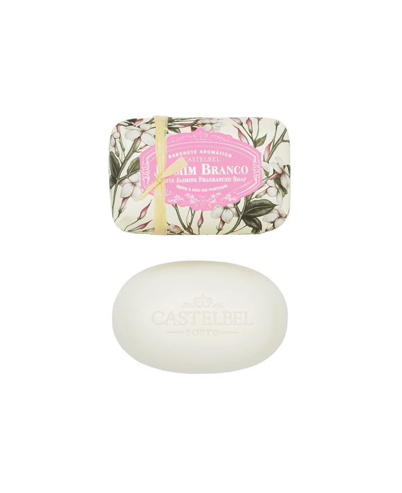 Os sabonetes Castelbel Jasmim Branco são elaborados com matérias-primas da mais alta qualidade e embrulhados à mão em embalagens com ilustrações de jasmim branco. Para além do design único e o aroma encantador do Jasmim Branco, cada sabonete produz uma espuma cremosa e suave que limpa a pele enquanto a perfuma.